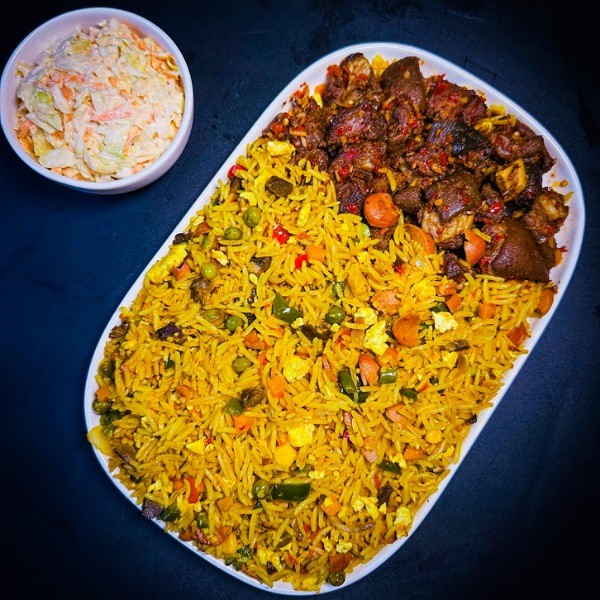 Prepared with Shrimps, Eggs, Sausage, Sweet-corn, Veggies and Spicy Goat Meat, Served with Coleslaw and Diced Fried Plantain.