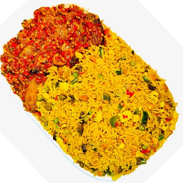 Prepared with Shrimps, Egg, Sausage, Sweet Corn, Veggies, Served with Spicy Turkey Wings, Coleslaw and Diced Fried Plantain.